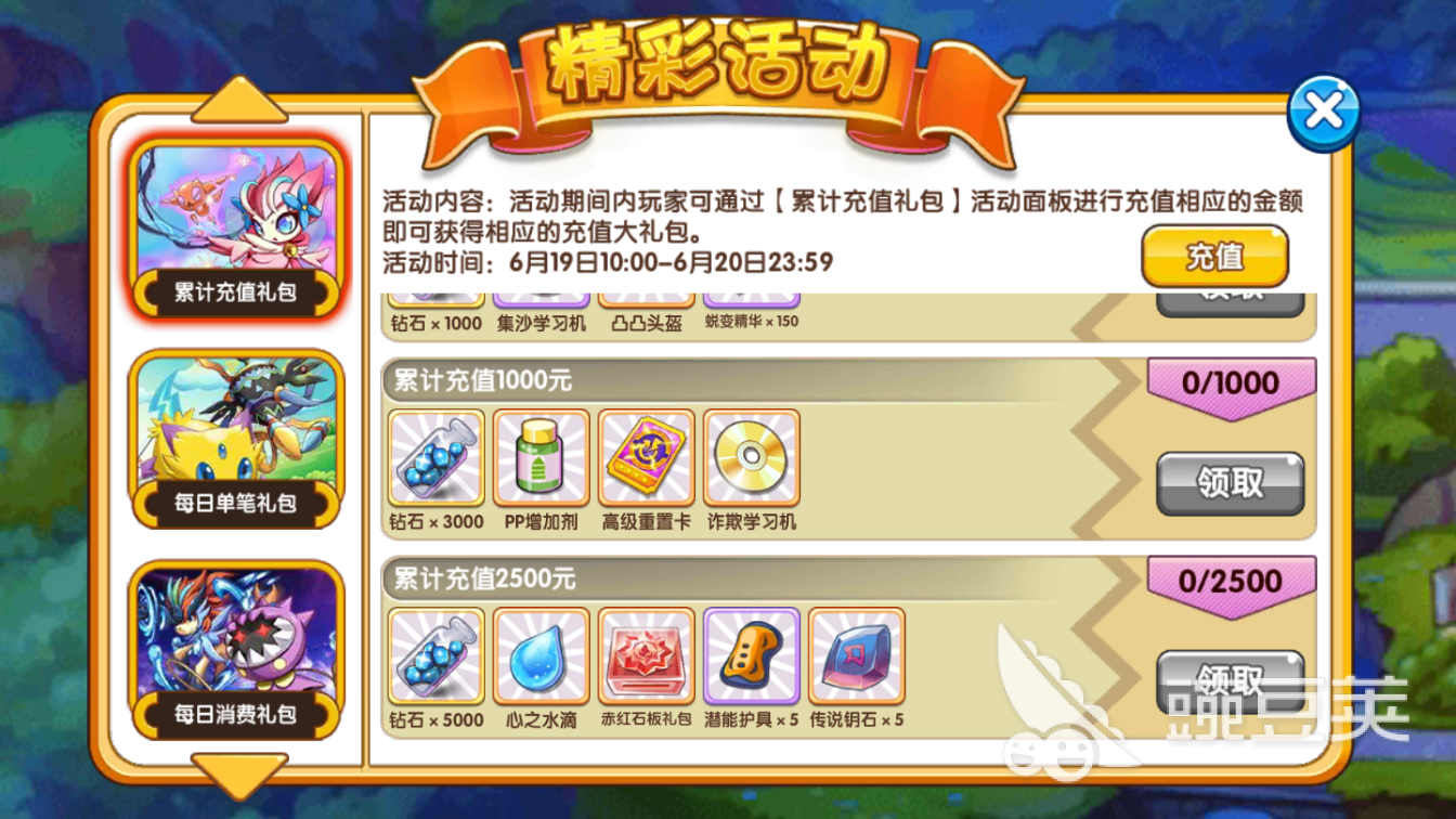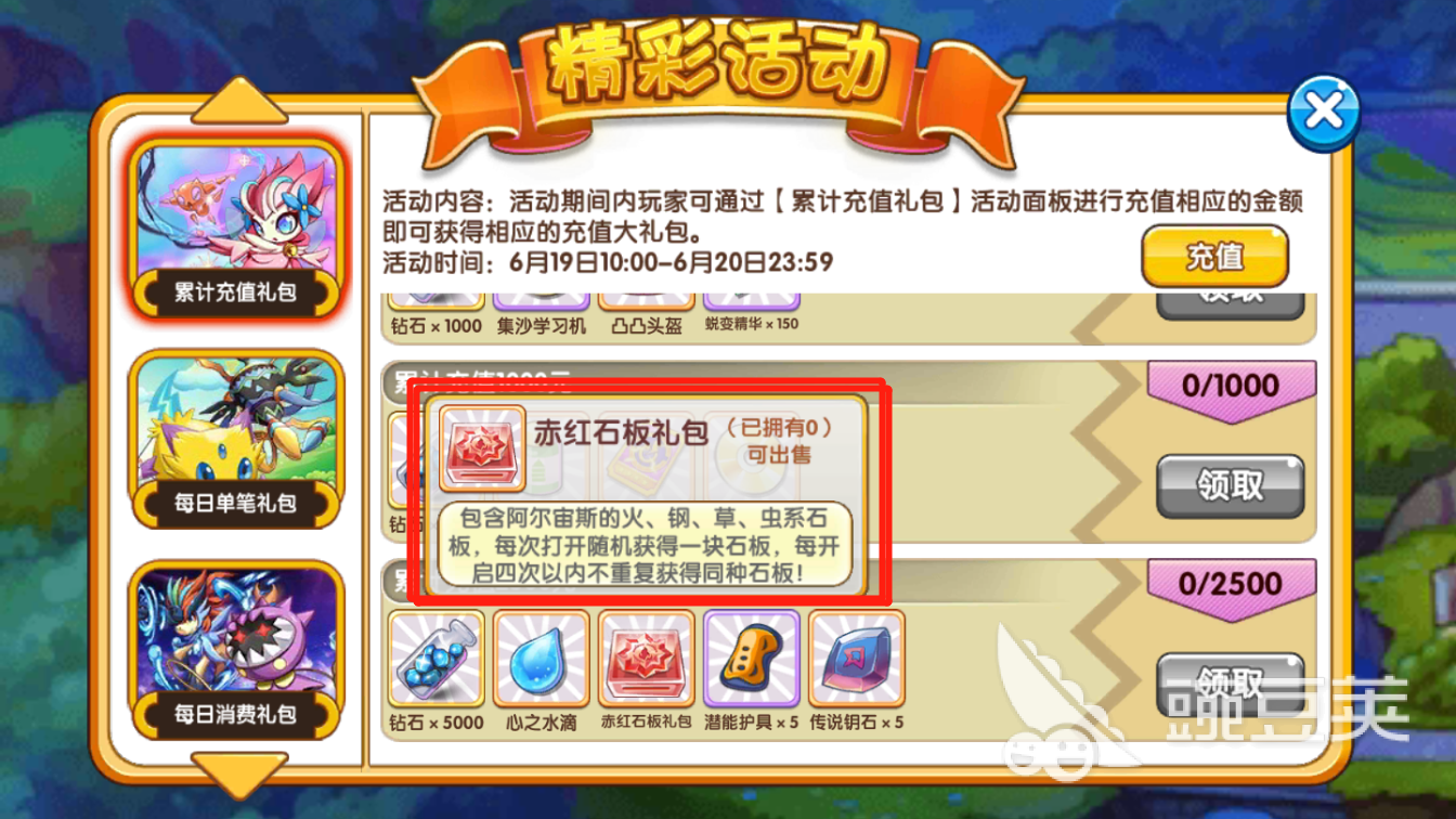(2)累計充值禮包活動的2025精準資料免費最后一項累計充值2500元,可以獲得赤紅石板禮包,以及鉆石等獎勵。