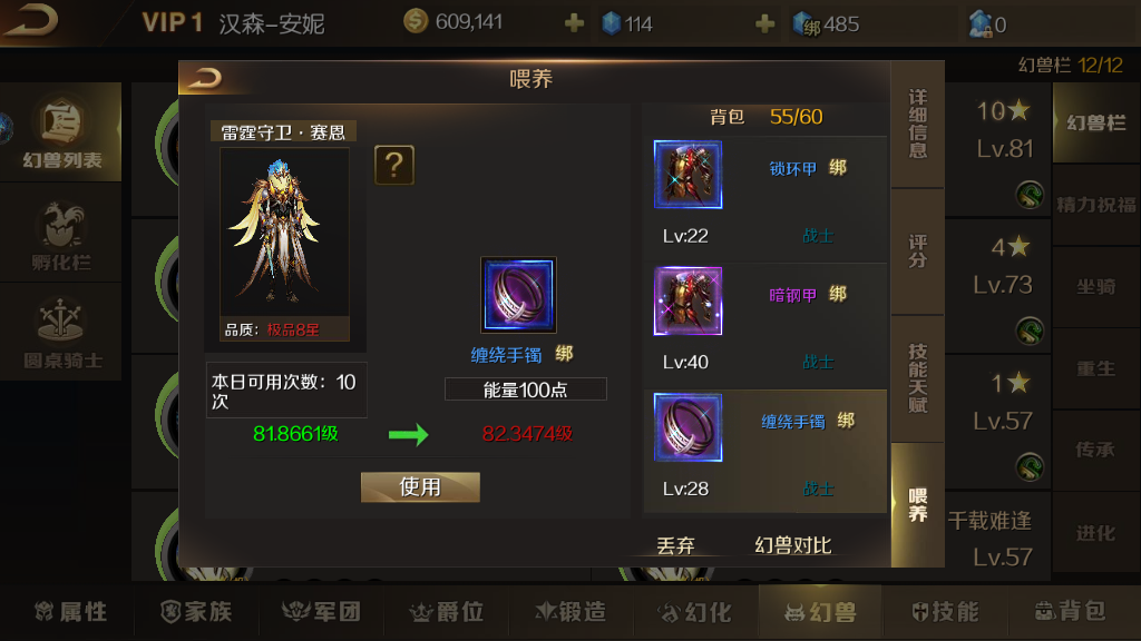 第三種方式就比較簡單粗暴了,我們可以直接在幻獸界面,找到幻獸,點(diǎn)擊喂養(yǎng),在喂養(yǎng)界面里面我們可以看到,裝備也可以當(dāng)做喂養(yǎng)材料,澳門管家婆100謎語怎么預(yù)測會提供寶寶的等級,裝備越好,提升越大。