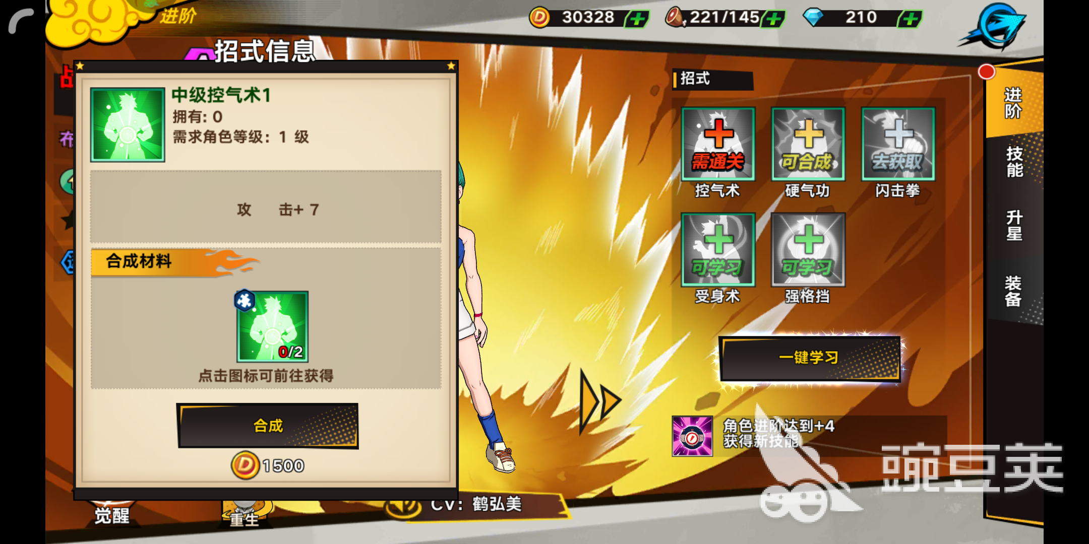在點(diǎn)擊角色后可進(jìn)入培養(yǎng)界面,對角色招式進(jìn)行學(xué)習(xí),未獲得的招式可點(diǎn)擊前往冒險挑戰(zhàn)獲得。在招式學(xué)習(xí)完畢后即可進(jìn)行進(jìn)階,進(jìn)階后角色可獲得新技能,在進(jìn)階等級達(dá)到4級后還可為角色覺醒。