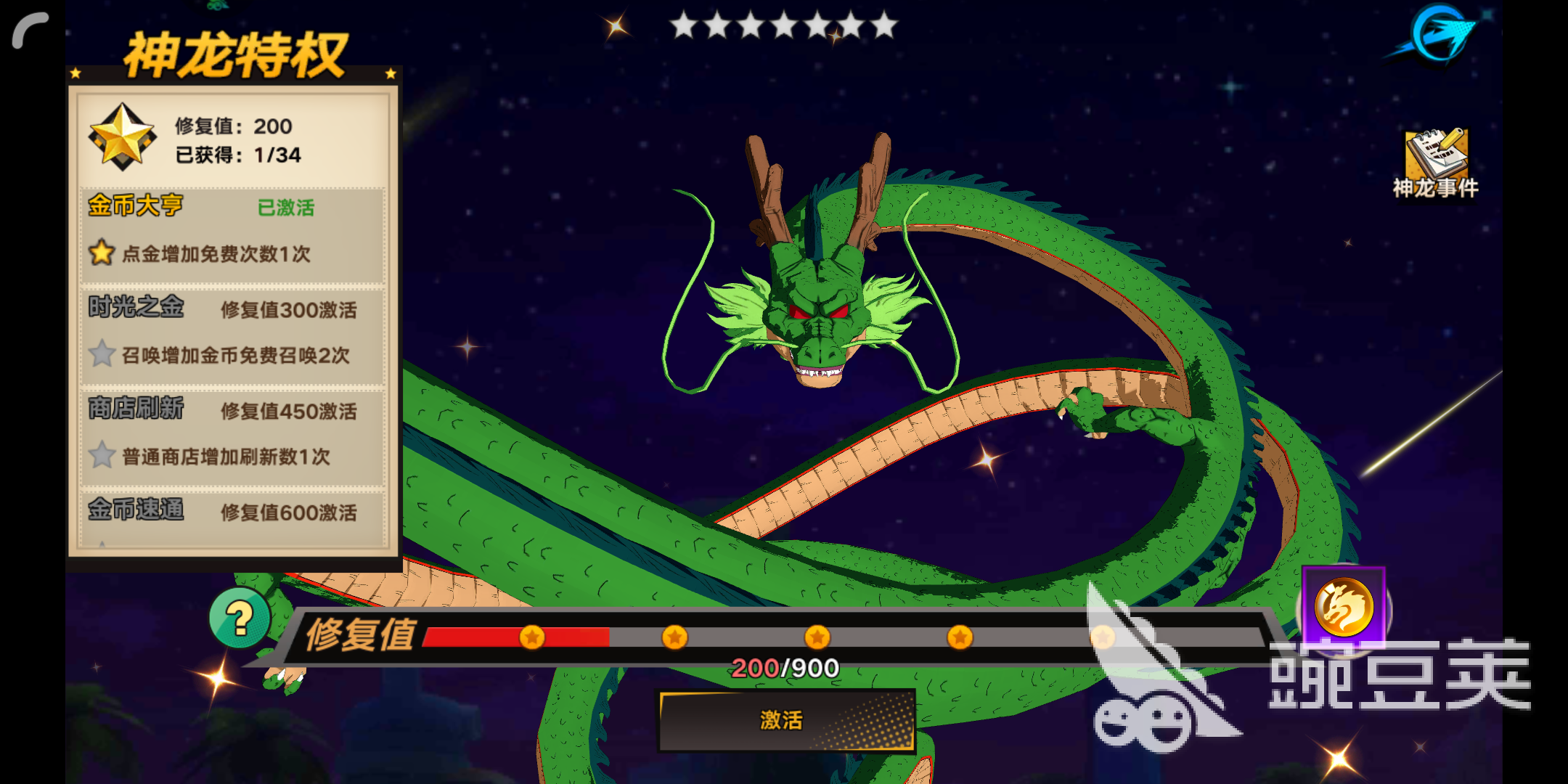 玩家在日常任務(wù) 中可獲得神龍精魄,獲得的精魄用于為神龍進(jìn)行修復(fù),修復(fù)值的提升可為玩家解鎖更多的特權(quán)加成。集齊龍珠進(jìn)行召喚神龍也可獲得修復(fù)值,完成神龍的每日隨機(jī)事件也可進(jìn)行修復(fù)值得獲取。