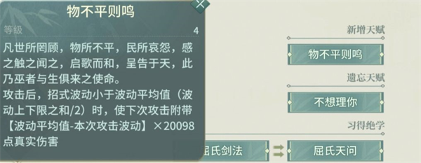 評價:屈心真實傷害=(當(dāng)前招式波動結(jié)算后波動平均系數(shù)-本次攻擊波動系數(shù))×真?zhèn)A(chǔ)值。真?zhèn)A(chǔ)值受基礎(chǔ)攻擊影響,而攻擊波動差值系數(shù)主要受屈心天賦“劍光浮沉”影響,利用高上限和低下限轉(zhuǎn)化真?zhèn)?/p>