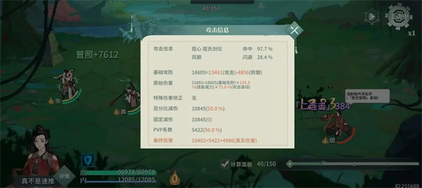 由于“劍光浮沉”,屈心威力波動取兩端,再根據(jù)戰(zhàn)斗效果附加技能威力結(jié)算額外威力值。